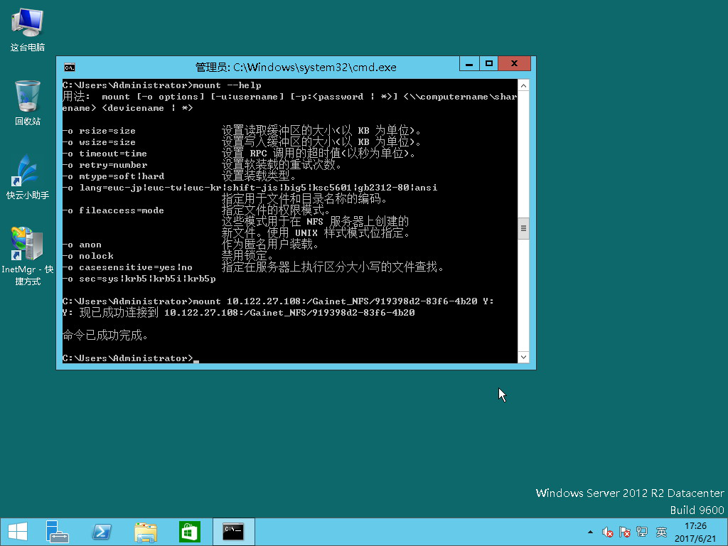 命令:mount 10.122.27.108:/Gainet_NFS/919398d2-83f6-4b20 Y: