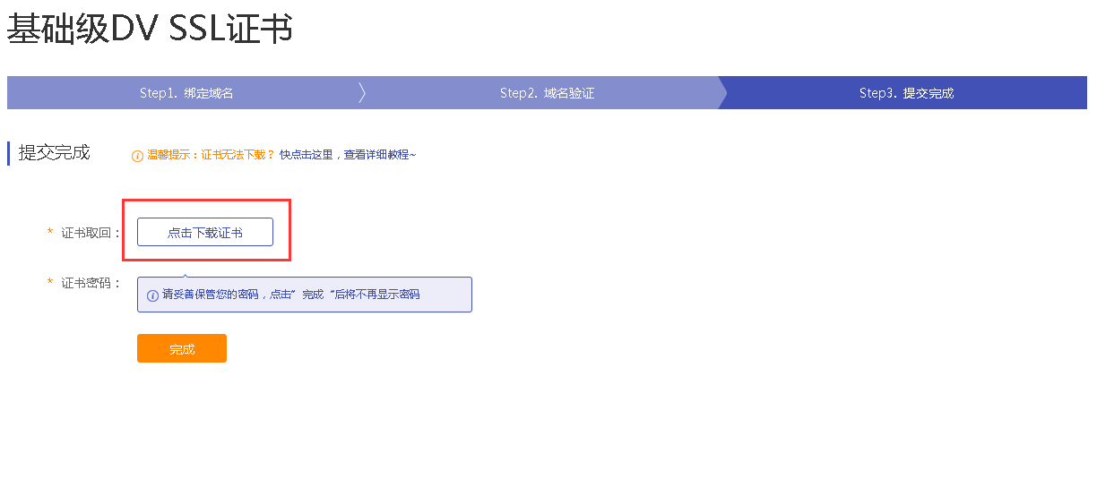 2.每個(gè)證書下載鏈接有效性只有一次,當(dāng)?shù)谝淮吸c(diǎn)擊出現(xiàn)下載證書未立即保存時(shí),再次點(diǎn)擊,就會(huì)失效,提示上圖所示;遇到該情況,可點(diǎn)擊完成,在訂單列表處,點(diǎn)擊”重新頒發(fā)”,待2分鐘后審核通過即可再次取回證書。