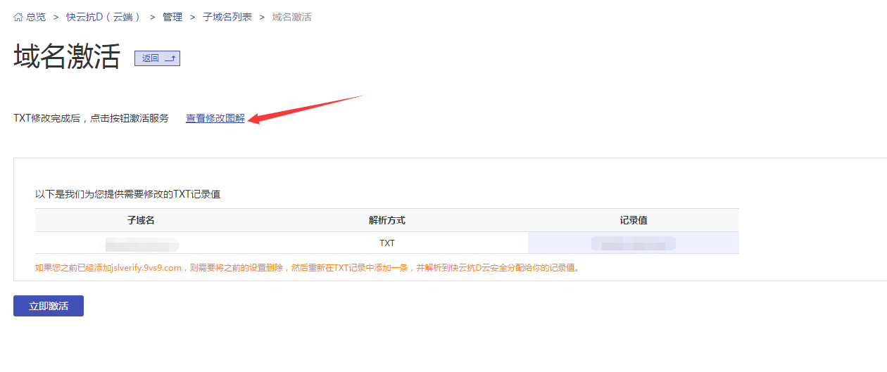 第五步:最后,回到管理頁面,這里會有激活按鈕,點擊“激活”按鈕進行激活操作(部分產(chǎn)品需聯(lián)系商務(wù)進行操作)。當激活完成后,整個開通流程就結(jié)束了,您可進行添加子域名和查看報表等的相關(guān)操作了!