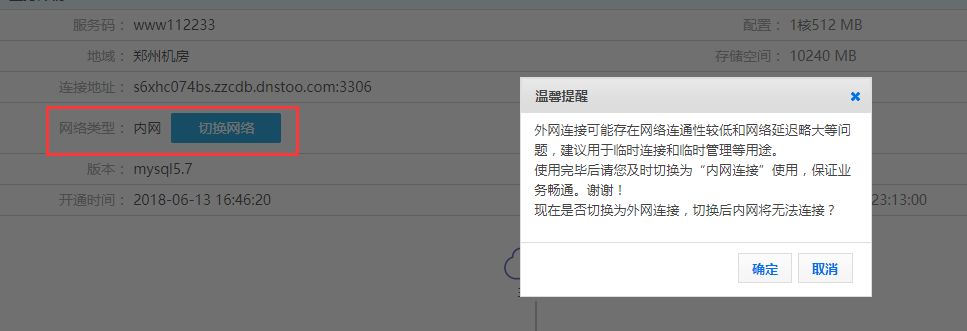 這里需要注意的是,如果是從外部訪問數據庫,需要使用外網訪問。登錄到管理平臺中,查看現在使用的網絡是否是外網,如果不是,點擊“切換網絡”,將其切換到外網。