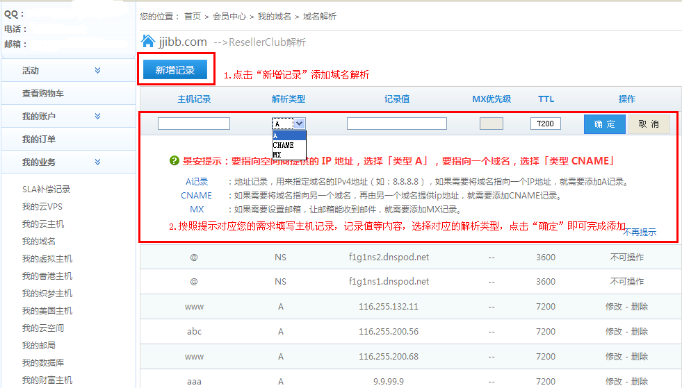 域名解析還可通過第三方解析平臺DNSPOD解析進行,詳情點擊鏈接http://m.0595cq.com/main/help/showHelpContent/id_412.html
