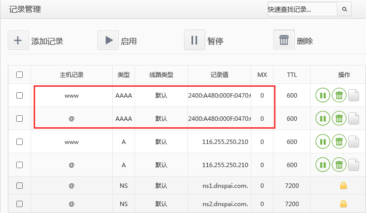 3、點擊域名進入域名記錄管理,為保證更換DNS后各項解析記錄有效,可通過“添加記錄”按鈕將原有解析平臺的記錄(A記錄、MX記錄等)在DNSPai平臺添加一遍。